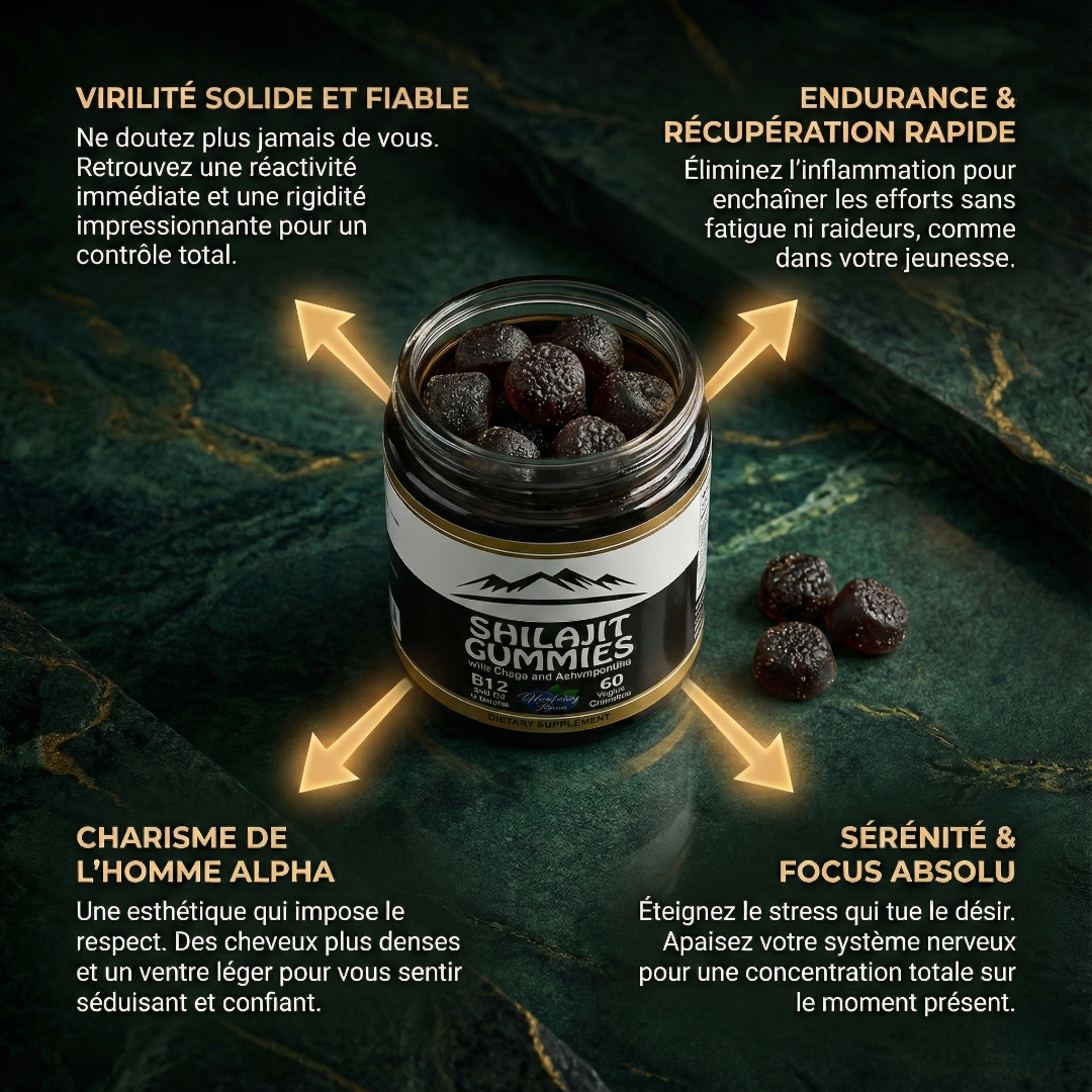 Le Shilajit apporte plus de 84 minéraux et de l'acide fulvique directement à vos cellules. Cela permet à votre corps de relancer naturellement sa production de testostérone, d'améliorer la circulation sanguine (essentielle pour la rigidité) et de réduire le cortisol (stress) qui tue la libido.